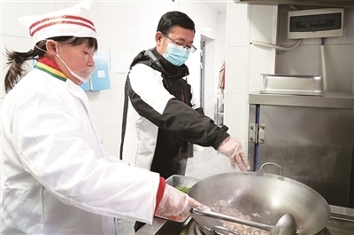 糜師傅邊切肉邊說:“得把肉塊切得小一點、薄一點,一會兒白菜不能用手撕,也要用刀切,切細碎。要不營養(yǎng)師那通不過!”