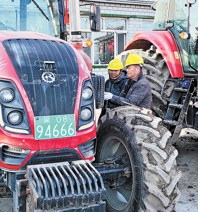 農(nóng)機(jī)庫里,社員程傳寶蹲在拖拉機(jī)旁仔細(xì)檢查,反復(fù)確認(rèn)有沒有漏油,或者零件松動(dòng)。