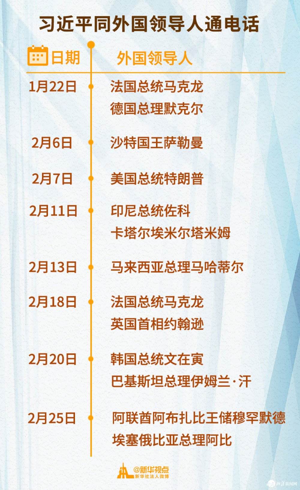 2月以來,習(xí)近平主席已先后同11位外國領(lǐng)導(dǎo)人通電話,涉及國家遍及亞洲、歐洲、非洲、美洲等地區(qū)。