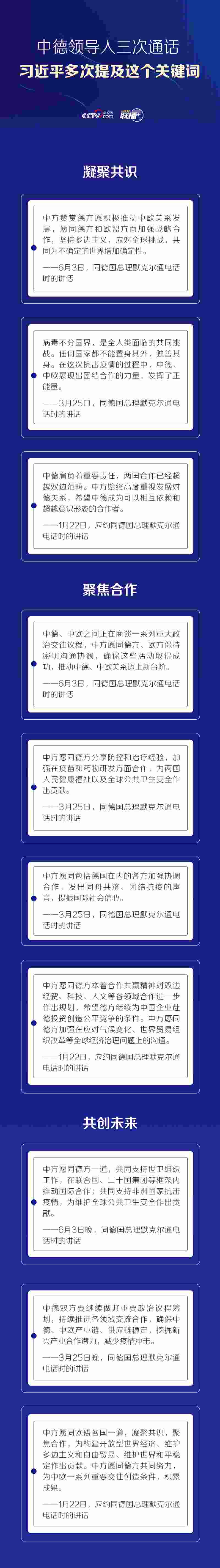 聯(lián)播+6月3日晚,習(xí)近平主席同德國(guó)總理默克爾通電話。這是自新冠肺炎疫情暴發(fā)以來(lái),雙方第三次通話。習(xí)近平強(qiáng)調(diào),近日中德“快捷通道”正式啟動(dòng),這有利于幫助兩國(guó)有需求的企業(yè)加快復(fù)工復(fù)產(chǎn),維護(hù)國(guó)際產(chǎn)業(yè)鏈、供應(yīng)鏈穩(wěn)定。