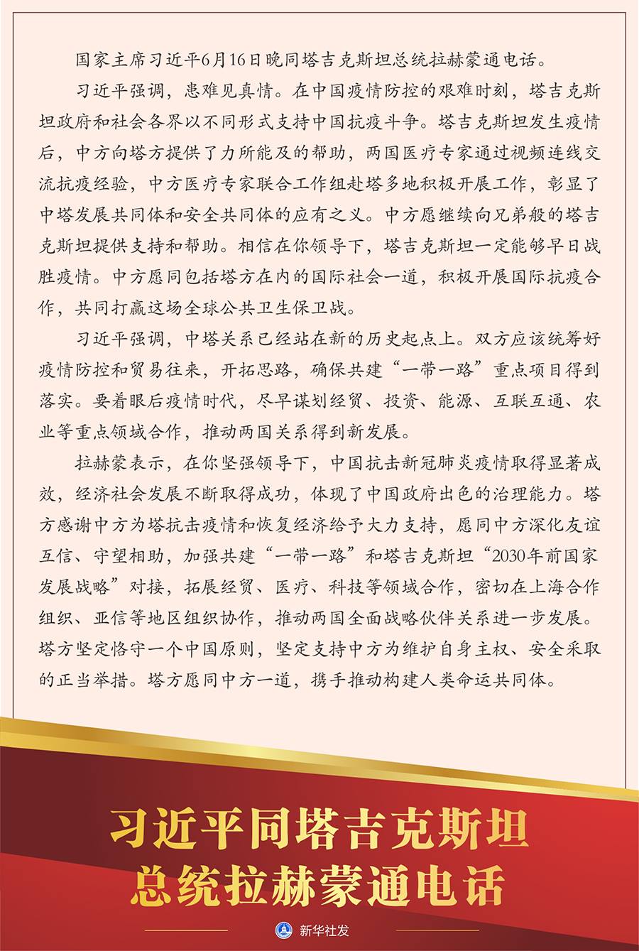 習(xí)近平強(qiáng)調(diào),患難見真情。在中國(guó)疫情防控的艱難時(shí)刻,塔吉克斯坦政府和社會(huì)各界以不同形式支持中國(guó)抗疫斗爭(zhēng)。塔吉克斯坦發(fā)生疫情后,中方向塔方提供了力所能及的幫助,兩國(guó)醫(yī)療專家通過(guò)視頻連線交流抗疫經(jīng)驗(yàn),中方醫(yī)療專家聯(lián)合工作組赴塔多地積極開展工作,彰顯了中塔發(fā)展共同體和安全共同體的應(yīng)有之義。中方愿繼續(xù)向兄弟般的塔吉克斯坦提供支持和幫助。相信在你領(lǐng)導(dǎo)下,塔吉克斯坦一定能夠早日戰(zhàn)勝疫情。中方愿同包括塔方在內(nèi)的國(guó)際社會(huì)一道,積極開展國(guó)際抗疫合作,共同打贏這場(chǎng)全球公共衛(wèi)生保衛(wèi)戰(zhàn)。