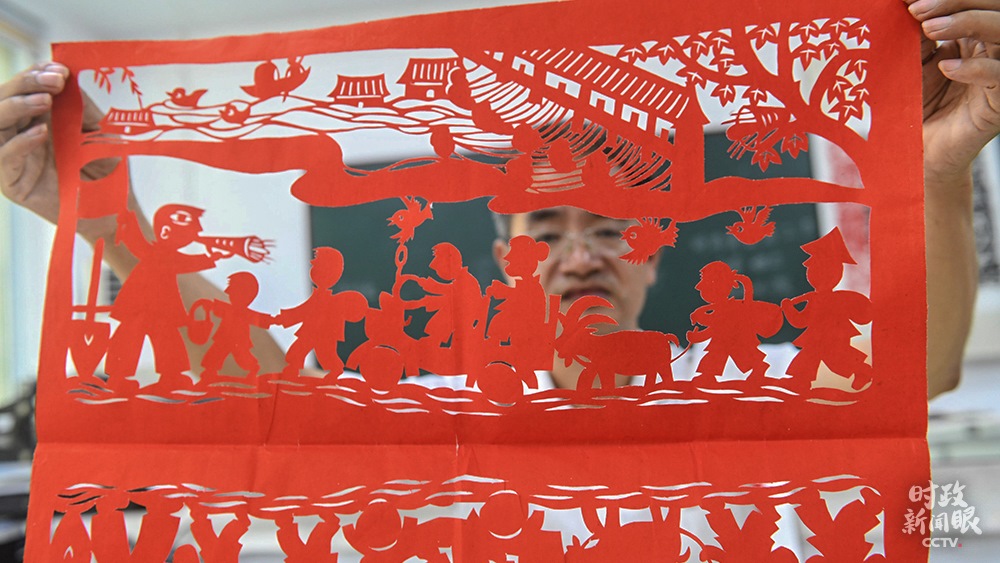 △安徽阜陽市,剪紙藝術家葛庭友展示創(chuàng)作的“安全轉移群眾”作品。