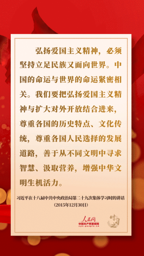 弘揚(yáng)愛(ài)國(guó)主義精神,必須堅(jiān)持立足民族又面向世界。中國(guó)的命運(yùn)與世界的命運(yùn)緊密相關(guān)。我們要把弘揚(yáng)愛(ài)國(guó)主義精神與擴(kuò)大對(duì)外開(kāi)放結(jié)合進(jìn)來(lái),尊重各國(guó)的歷史特點(diǎn)、文化傳統(tǒng),尊重各國(guó)人民選擇的發(fā)展道路,善于從不同文明中尋求智慧、汲取營(yíng)養(yǎng),增強(qiáng)中華文明生機(jī)活力。
