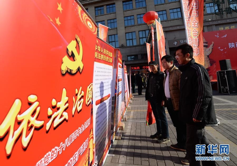 西安市民在國(guó)家憲法日宣傳活動(dòng)現(xiàn)場(chǎng)觀看依法治國(guó)宣傳展板(2014年12月4日攝)。新華社記者李一博攝