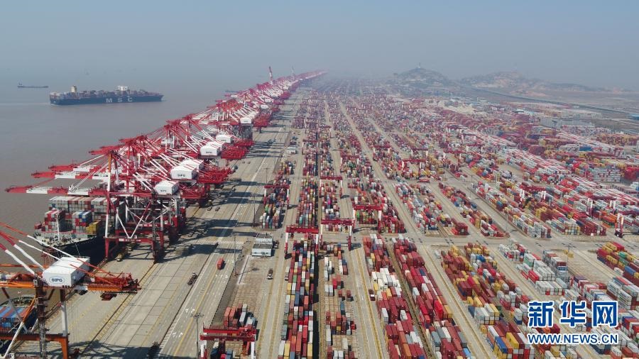 這是3月18日拍攝的上海洋山港集裝箱碼頭(無人機(jī)照片)。新華社記者 丁汀 攝