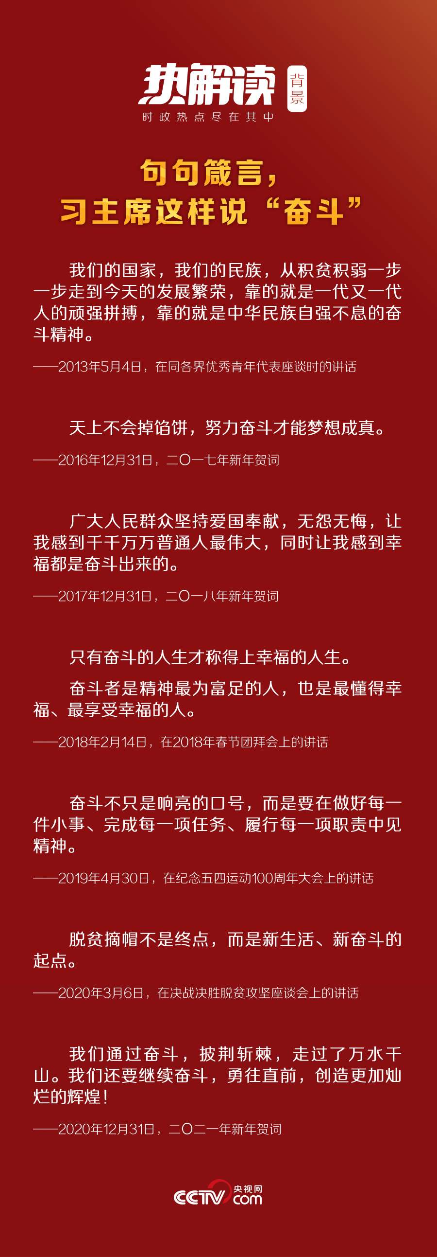 2020年,“十三五”圓滿收官,“十四五”全面擘畫;2021年,既是“十四五”開局之年,又是“兩個一百年”的歷史交匯點,全面建設(shè)社會主義現(xiàn)代化國家新征程即將開啟。在這個關(guān)鍵節(jié)點再次強調(diào)“奮斗”,習(xí)近平主席意蘊深遠。
