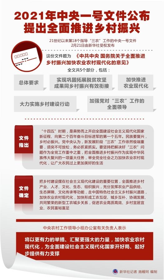 這份文件題為《中共中央 國(guó)務(wù)院關(guān)于全面推進(jìn)鄉(xiāng)村振興加快農(nóng)業(yè)農(nóng)村現(xiàn)代化的意見》,全文共5個(gè)部分,包括:總體要求、實(shí)現(xiàn)鞏固拓展脫貧攻堅(jiān)成果同鄉(xiāng)村振興有效銜接、加快推進(jìn)農(nóng)業(yè)現(xiàn)代化、大力實(shí)施鄉(xiāng)村建設(shè)行動(dòng)、加強(qiáng)黨對(duì)“三農(nóng)”工作的全面領(lǐng)導(dǎo)。