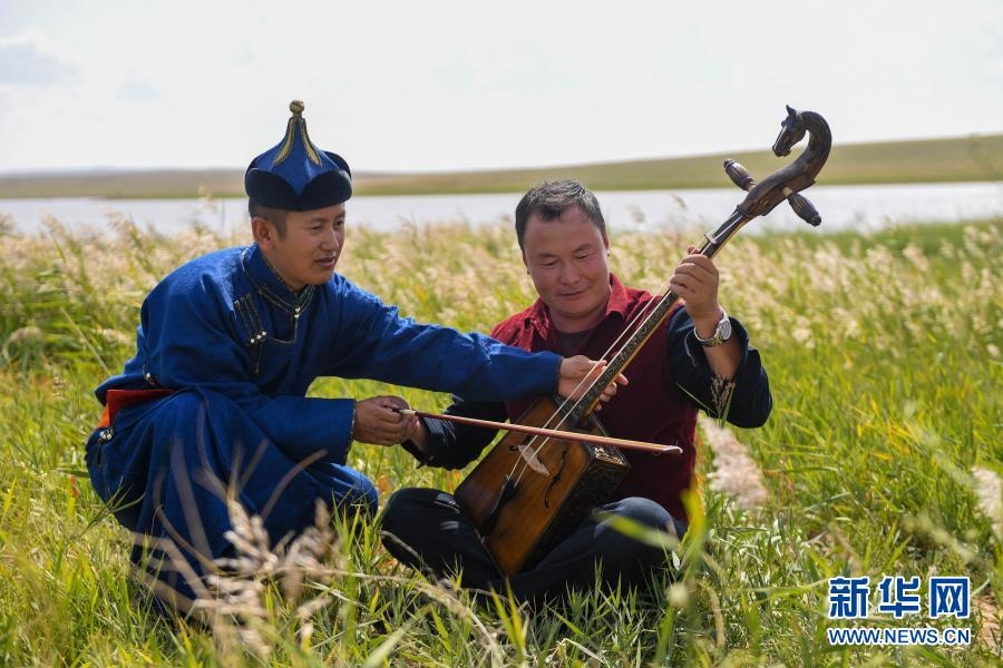 2018年9月13日,在內(nèi)蒙古自治區(qū)錫林郭勒盟鑲黃旗寶格達(dá)音高勒蘇木浩尼欽哈夏圖嘎查的一處草場(chǎng),演出結(jié)束后,鑲黃旗烏蘭牧騎的隊(duì)員教牧民拉馬頭琴。新華社記者 彭源 攝