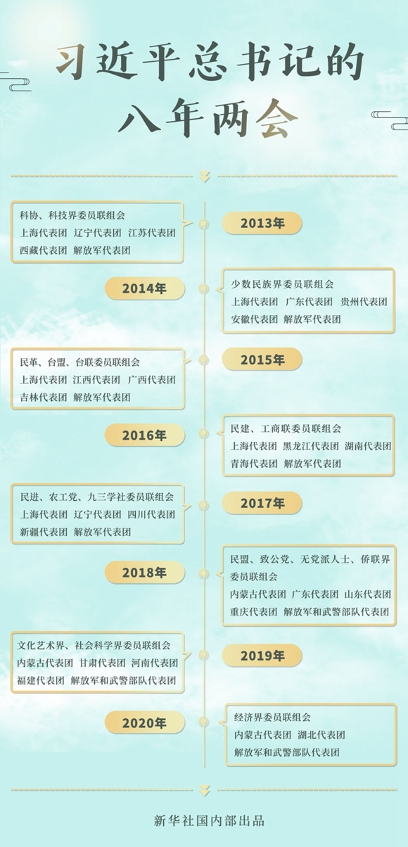 2013-2020,八年的全國兩會(huì)上,總書記46次到團(tuán)組參加審議討論。交流之中,語重心長;言談之間,發(fā)人深思。