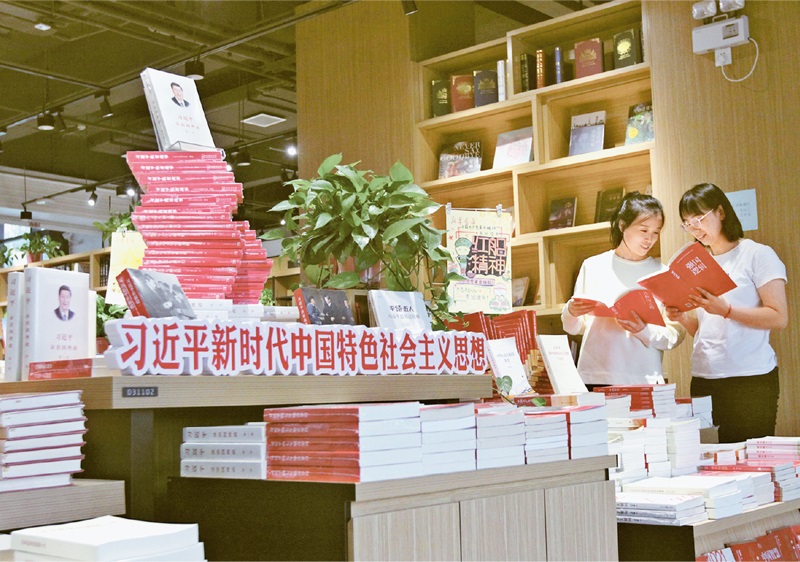 黨確立習(xí)近平同志黨中央的核心、全黨的核心地位,確立習(xí)近平新時代中國特色社會主義思想的指導(dǎo)地位,反映了全黨全軍全國各族人民共同心愿,對新時代黨和國家事業(yè)發(fā)展、對推進(jìn)中華民族偉大復(fù)興歷史進(jìn)程具有決定性意義。圖為2021年10月4日,河南省焦作市博愛縣新華書店里,讀者在閱讀習(xí)近平新時代中國特色社會主義思想相關(guān)書籍?!≈行律绨l(fā) 程全/攝