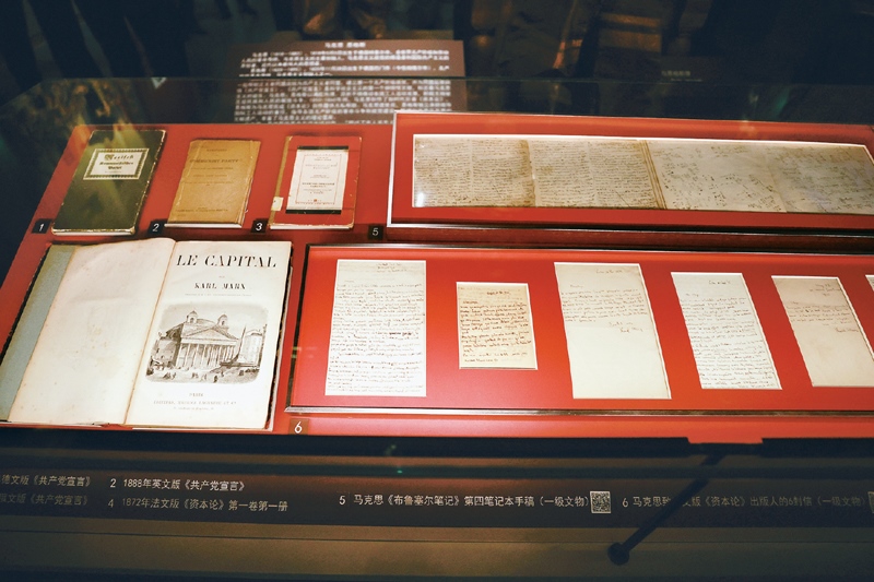 中國共產(chǎn)黨歷史展覽館的展廳里,陳列著多份珍貴的馬克思手稿。右上為馬克思《布魯塞爾筆記》第四筆記本手稿;右下為馬克思寫給《資本論》法文版出版人的六封書信。 中新社發(fā) 陳曉根/攝