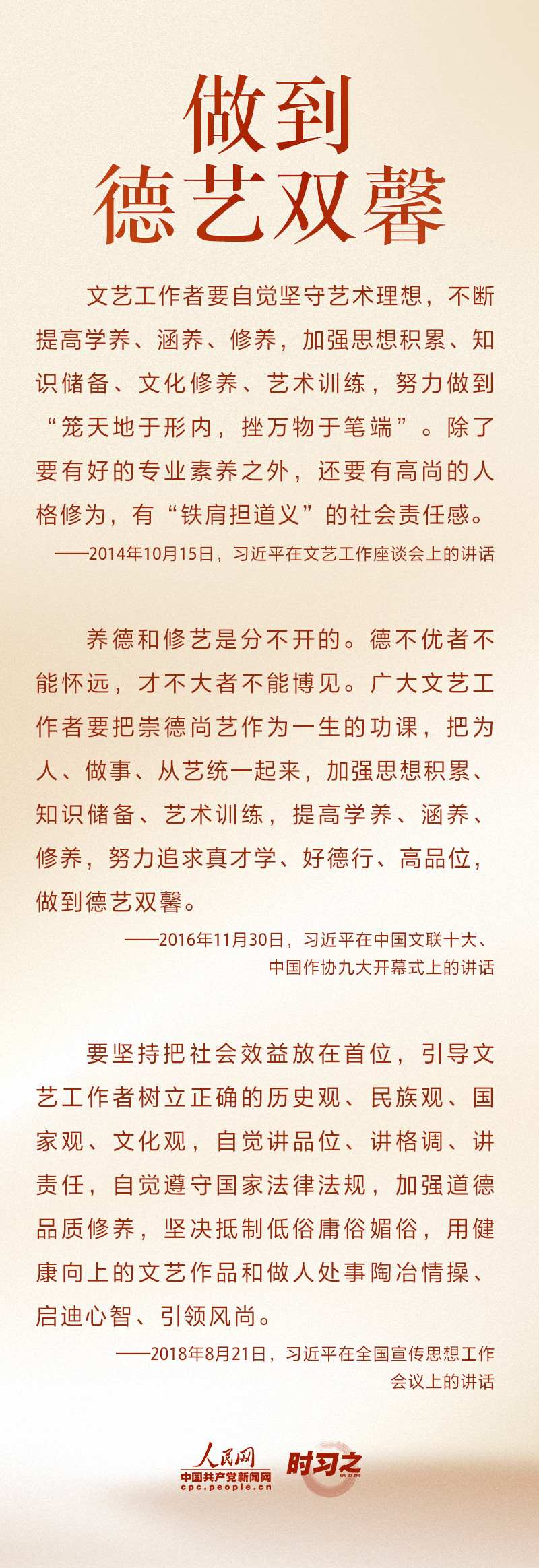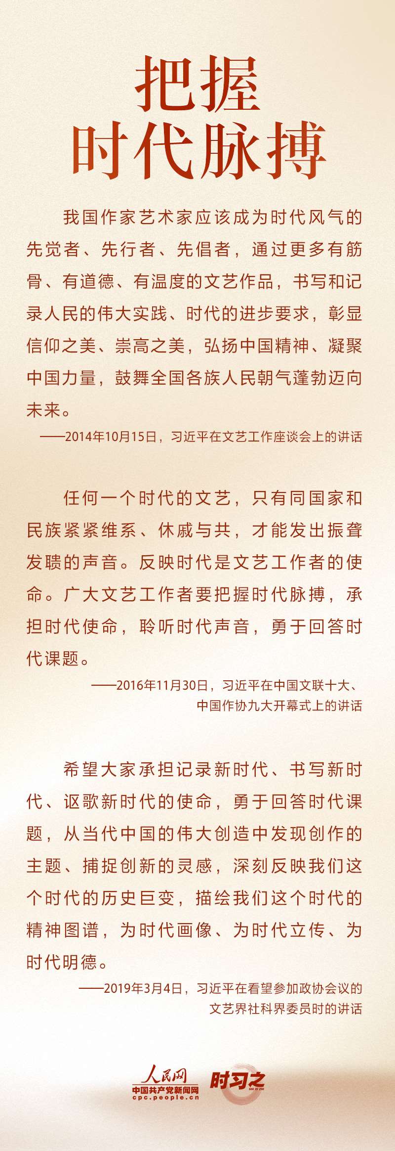 文運同國運相牽,文脈同國脈相連。新時代文藝工作者承擔(dān)著記錄新時代、書寫新時代、謳歌新時代的重大使命?!拔乃囀氰T造靈魂的工程,文藝工作者是靈魂的工程師。”黨的十八大以來,習(xí)近平不斷激勵文藝工作者不辜負(fù)時代召喚、不辜負(fù)人民期待,以德服人、以文化人。