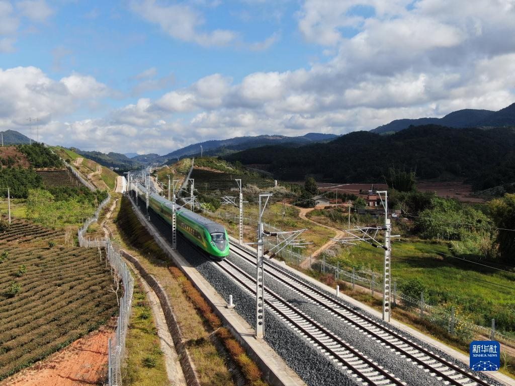 2022年1月3日,列車行駛在位于云南西雙版納傣族自治州景洪市境內(nèi)的中老鐵路上(無人機照片)。新華社發(fā)(李云生攝)