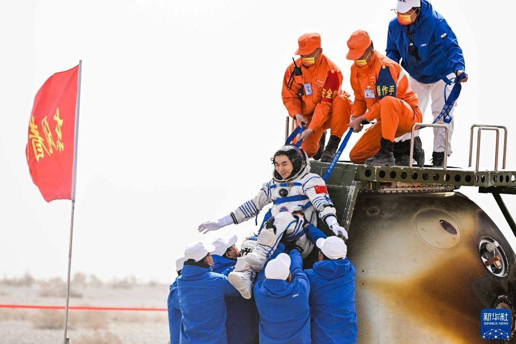 4月16日,神舟十三號載人飛船返回艙在東風(fēng)著陸場預(yù)定區(qū)域成功著陸。這是航天員翟志剛安全順利出艙。新華社記者 連振 攝