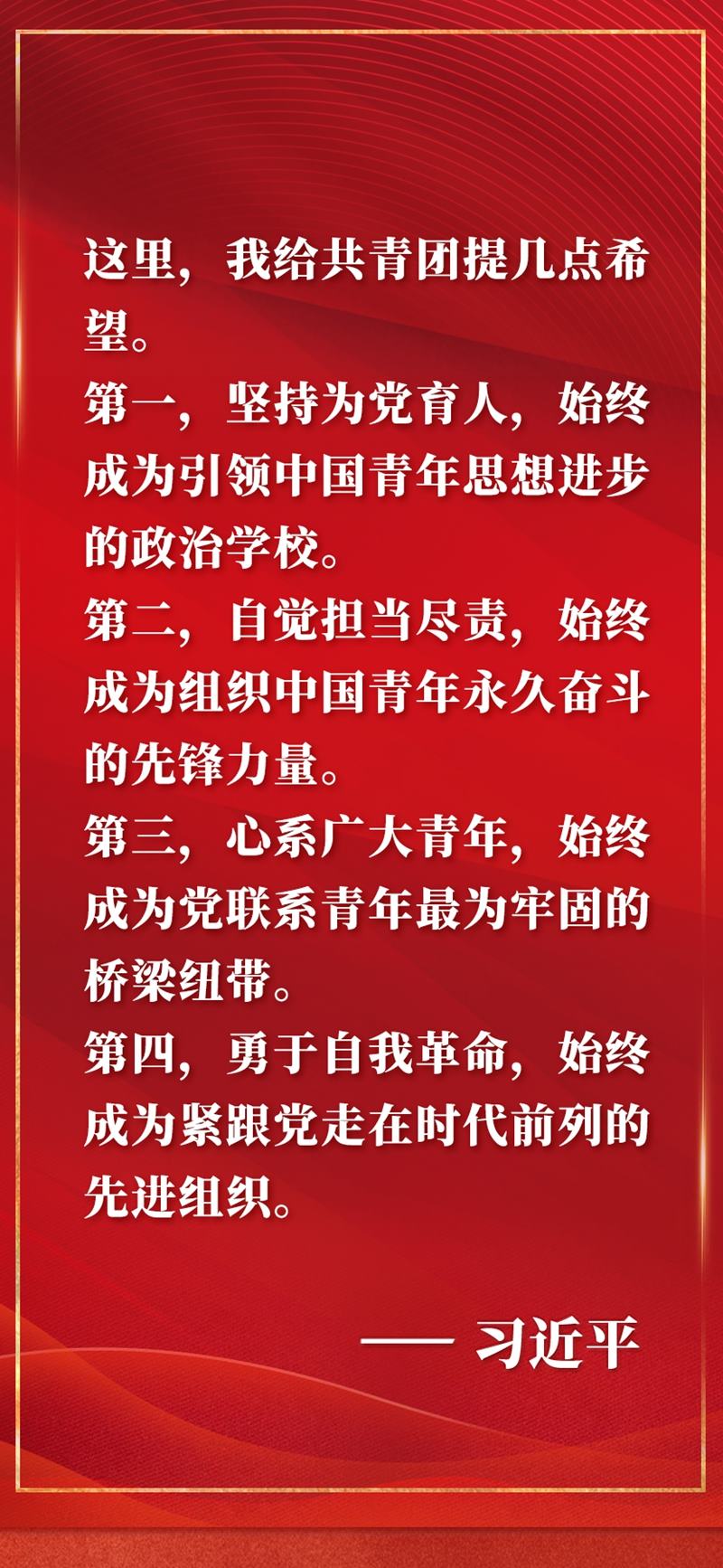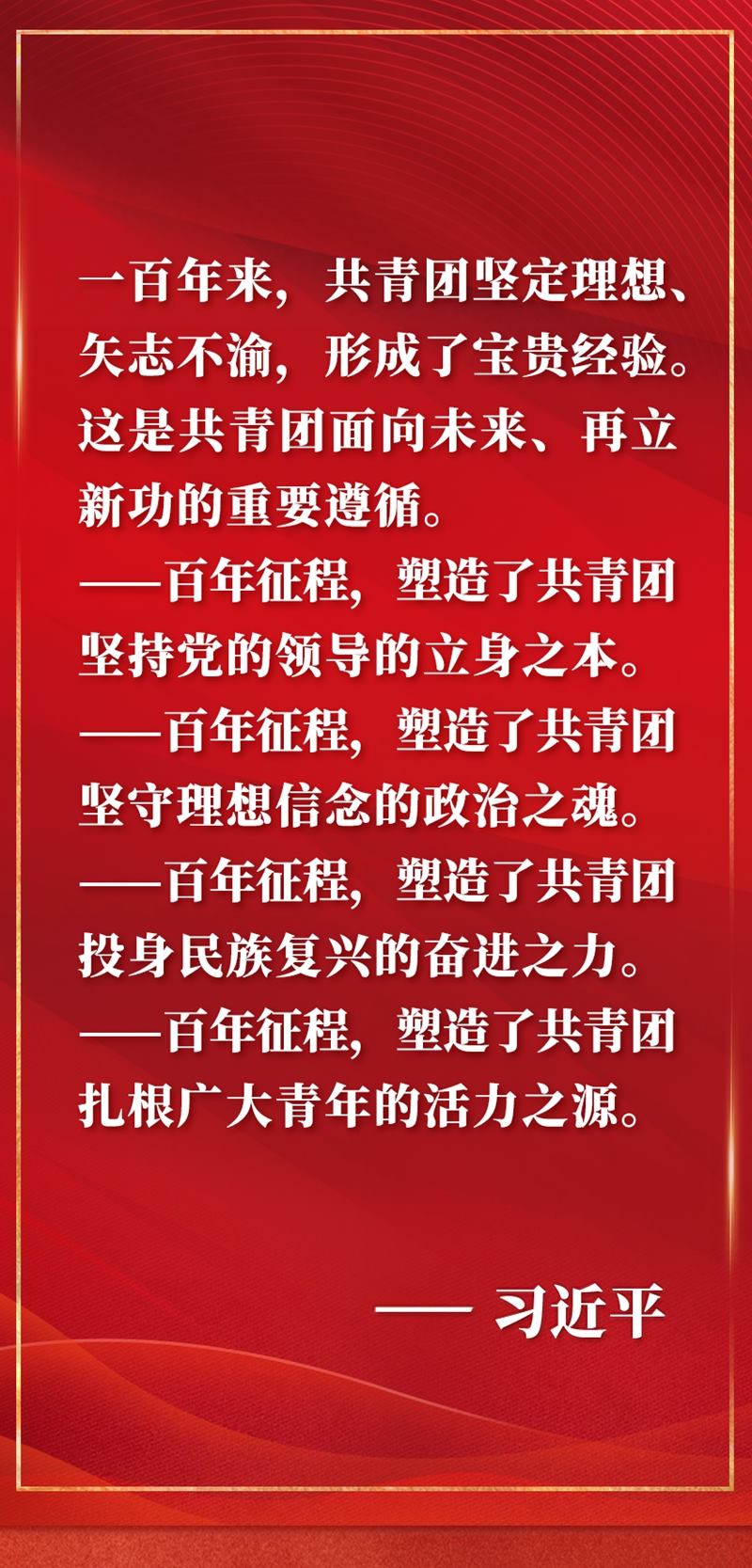 慶祝中國共產(chǎn)主義青年團(tuán)成立100周年大會(huì)10日上午在北京人民大會(huì)堂隆重舉行。中共中央總書記、國家主席、中央軍委主席習(xí)近平在會(huì)上發(fā)表重要講話,全面回顧百年來共青團(tuán)堅(jiān)定不移聽黨話、跟黨走的奮斗歷程,深刻闡明共青團(tuán)和青年工作的寶貴經(jīng)驗(yàn),對(duì)當(dāng)代青年寄予殷切期望,對(duì)做好新時(shí)代共青團(tuán)工作提出明確要求。