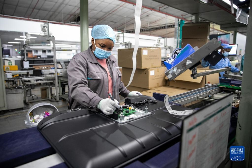 2022年6月1日,當(dāng)?shù)貑T工在南非開(kāi)普敦海信南非工業(yè)園的電視機(jī)生產(chǎn)線上工作。新華社記者呂天然攝
