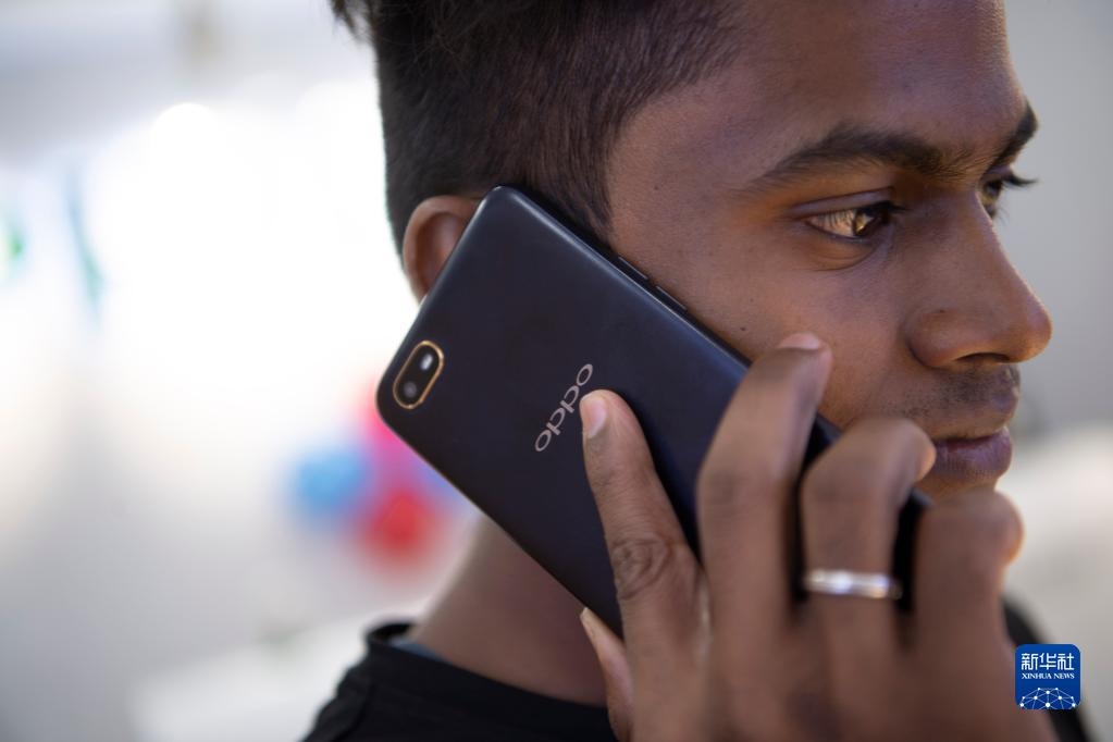 2019年10月8日,一名男子在印度金奈的一家商場(chǎng)使用中國(guó)品牌的手機(jī)。新華社記者呂小煒攝