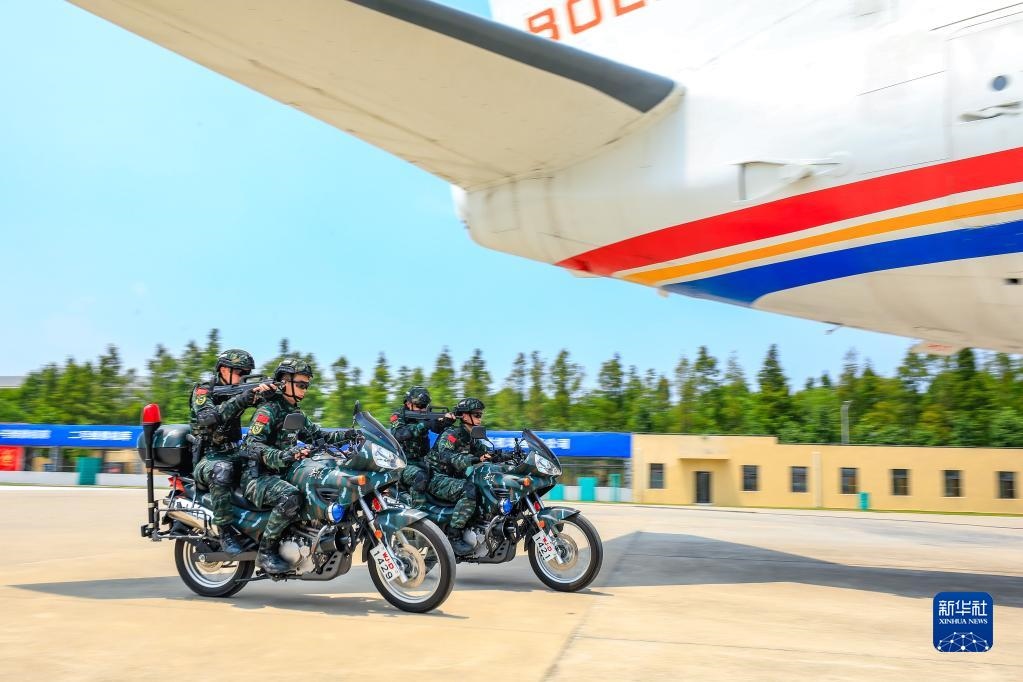 武警上海總隊機動第一支隊特戰(zhàn)某中隊組織交通工具反劫持綜合演練,特戰(zhàn)隊員乘坐摩托車接近“被劫持飛機”(2022年8月1日攝)。新華社發(fā)(李巖攝)