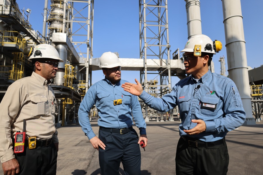 2022年11月27日,在沙特西部城市延布,中沙延布煉廠的員工在交流??偼顿Y86億美元的中沙延布煉廠是中國(guó)石化與沙特阿拉伯石油公司合資興建的項(xiàng)目,自2016年1月20日由兩國(guó)元首共同啟動(dòng)投產(chǎn)以來(lái),發(fā)展迅速。今年1月至8月累計(jì)實(shí)現(xiàn)利潤(rùn)11.5億美元。