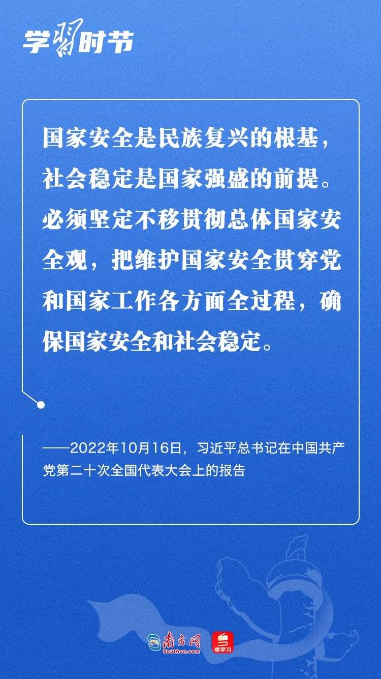 習(xí)近平總書記在黨的二十大報(bào)告中指出:“國家安全是民族復(fù)興的根基,社會穩(wěn)定是國家強(qiáng)盛的前提?!?月15日是我國第八個(gè)全民國家安全教育日。習(xí)近平總書記在2016年首個(gè)全民國家安全教育日到來之際曾強(qiáng)調(diào),實(shí)現(xiàn)中華民族偉大復(fù)興的中國夢,保證人民安居樂業(yè),國家安全是頭等大事。