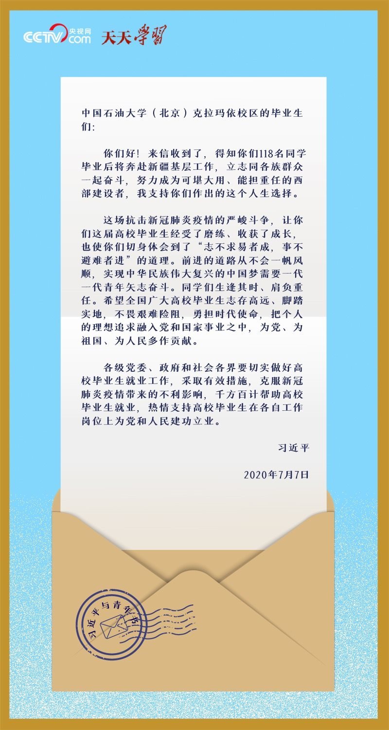 2020年畢業(yè)季,中國石油大學(xué)(北京)克拉瑪依校區(qū)118名即將到新疆基層就業(yè)的大學(xué)生,在離開母校之際,給習(xí)近平總書記寫信匯報(bào)了大學(xué)四年學(xué)習(xí)和思想上的收獲,表達(dá)了立志同各族群眾一起奮斗、建設(shè)美麗邊疆的決心。