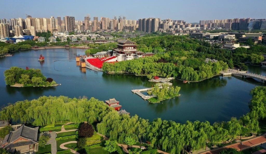 2023年4月25日的西安大唐芙蓉園(無人機照片)。新華社記者 劉瀟 攝