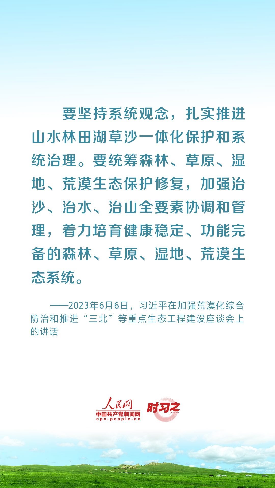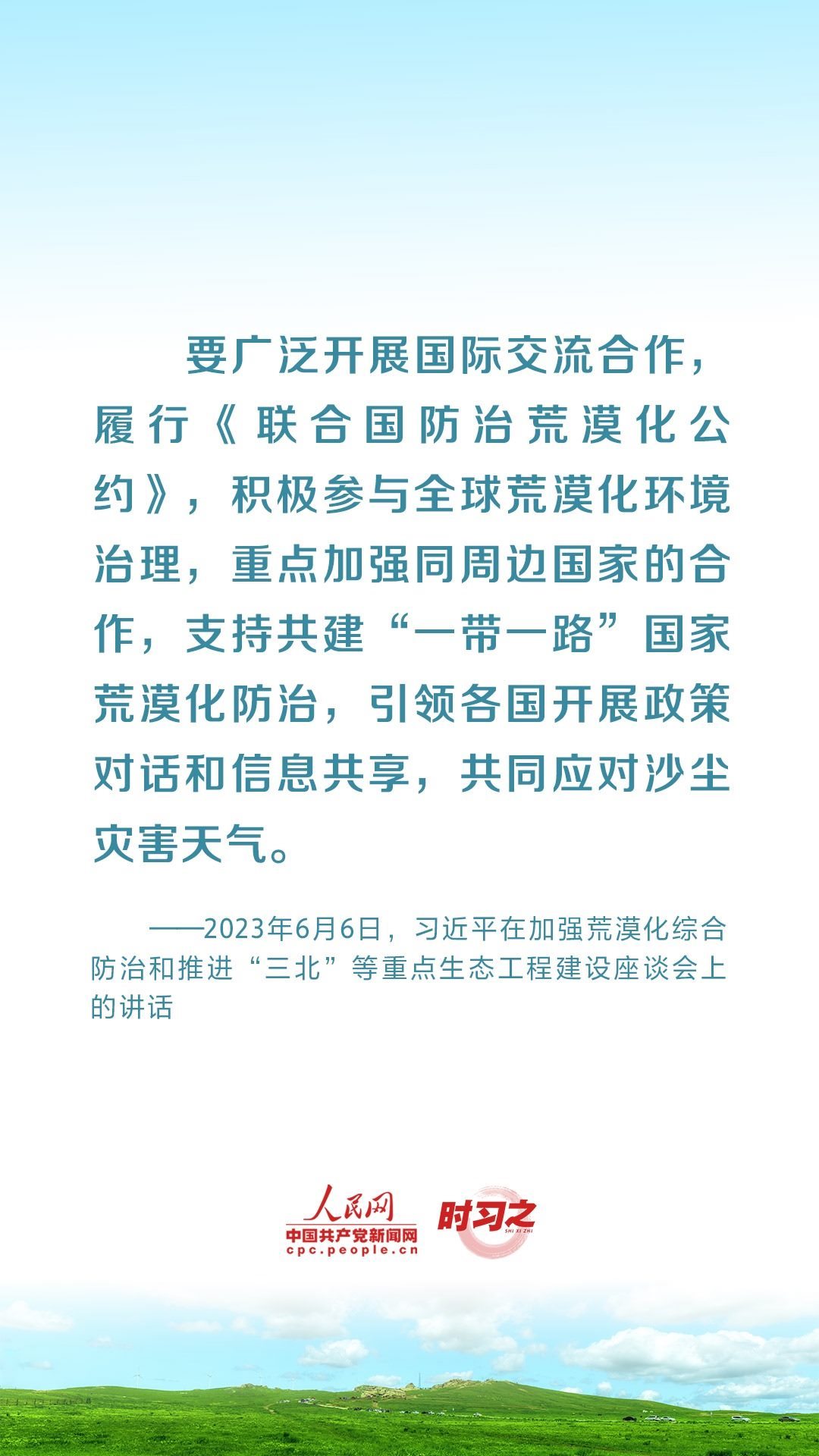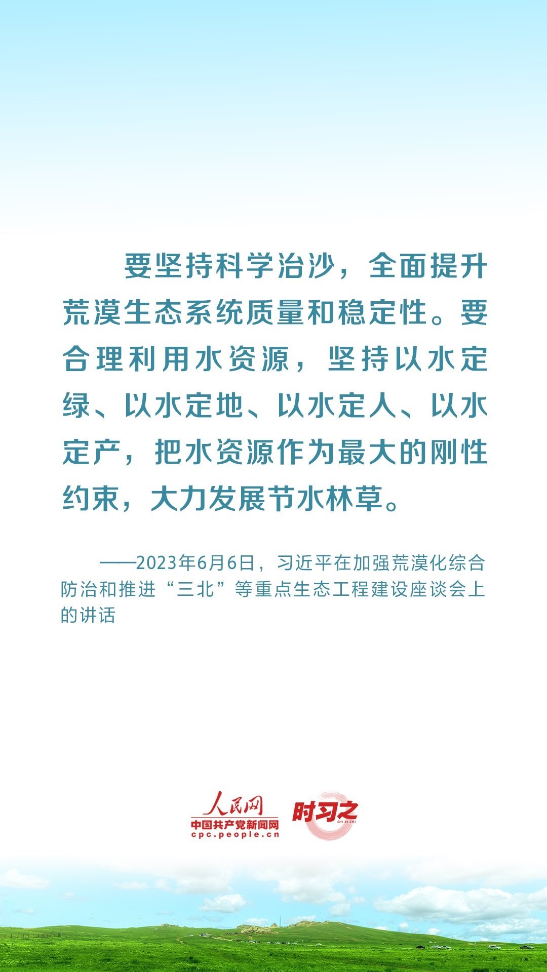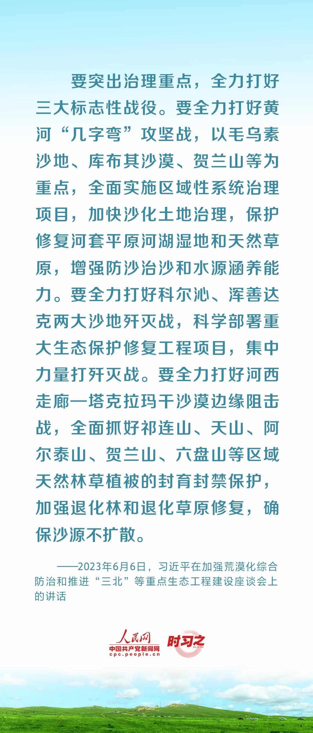 2023年6月5日至6日,中共中央總書(shū)記、國(guó)家主席、中央軍委主席習(xí)近平在內(nèi)蒙古自治區(qū)巴彥淖爾市考察,主持召開(kāi)加強(qiáng)荒漠化綜合防治和推進(jìn)“三北”等重點(diǎn)生態(tài)工程建設(shè)座談會(huì)并發(fā)表重要講話。座談會(huì)上,習(xí)近平對(duì)走好中國(guó)特色防沙治沙道路提出工作要求。