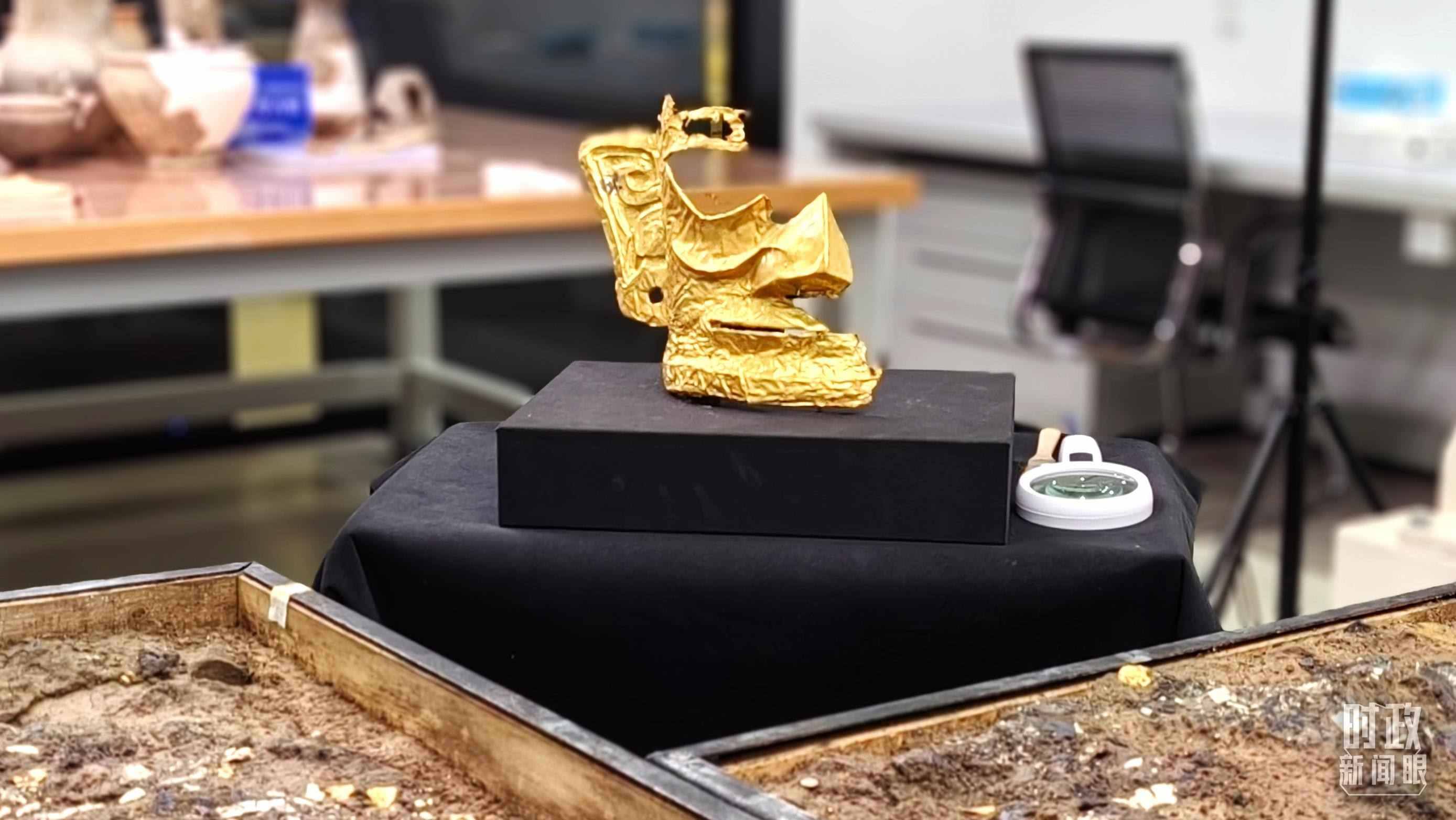 △文物保護修復展示中心內(nèi)正在修復的金面具。(總臺央視記者王萌萌拍攝)