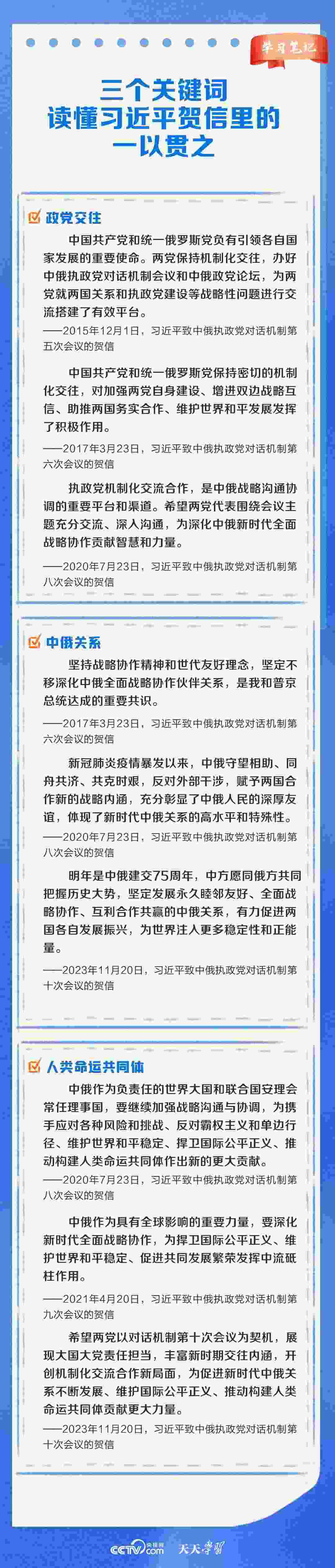 11月20日,中俄執(zhí)政黨對(duì)話(huà)機(jī)制第十次會(huì)議以視頻方式舉辦。習(xí)近平總書(shū)記同普京總統(tǒng)分別向會(huì)議致賀信。習(xí)近平總書(shū)記在賀信中強(qiáng)調(diào),中俄執(zhí)政黨對(duì)話(huà)機(jī)制已發(fā)展成為兩國(guó)鞏固政治互信、密切戰(zhàn)略協(xié)作、推進(jìn)互利合作的獨(dú)特渠道和平臺(tái)。