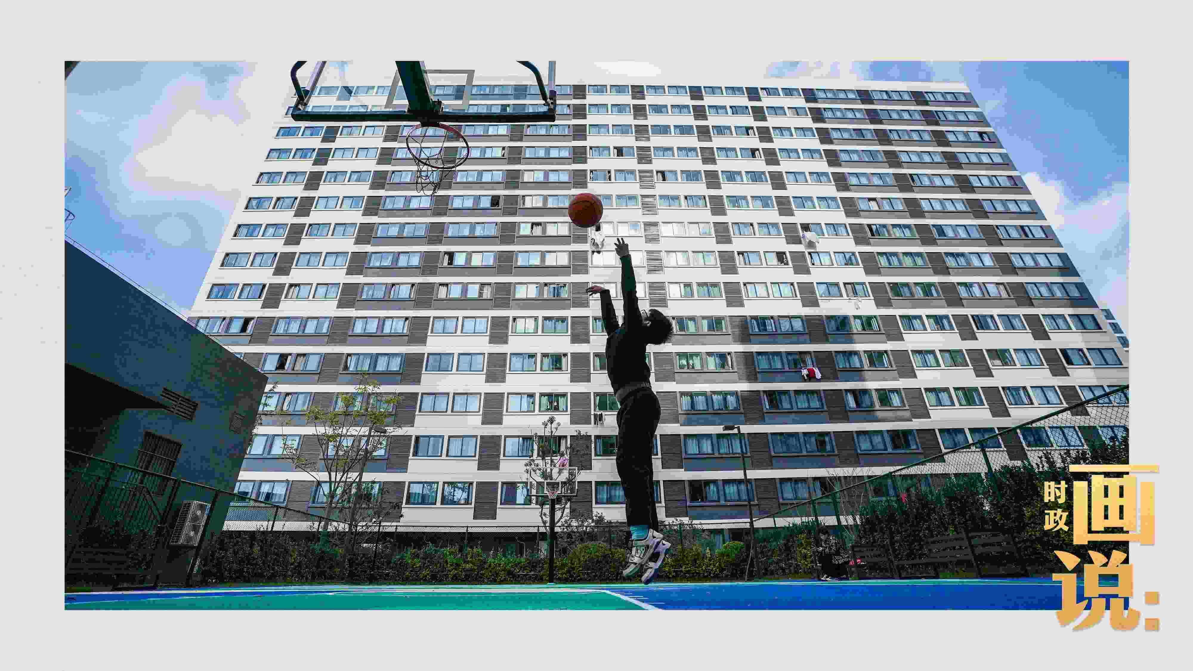 △社區(qū)籃球場上練習投籃的小男孩。閔行區(qū)新時代城市建設者管理者之家所在的社區(qū)是上海市首批大型保障性租賃住房項目之一,為許多來滬新市民、青年人和一線務工人員提供住房保障。閔行區(qū),上海。