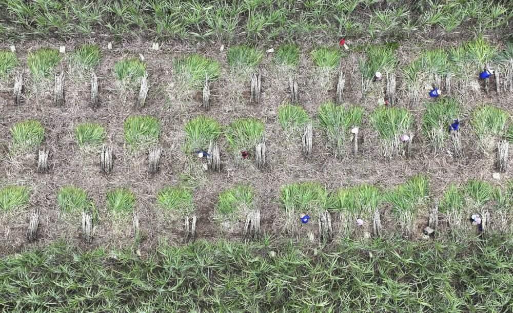 2023年12月12日,在廣西來(lái)賓市興賓區(qū)小平陽(yáng)鎮(zhèn),農(nóng)民在收割甘蔗(無(wú)人機(jī)照片)。新華社記者 周華 攝