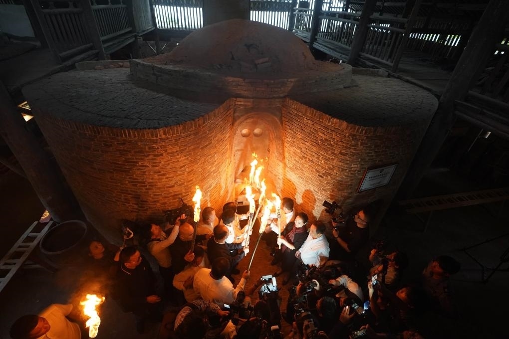 2023年10月19日,嘉賓與把樁師傅一起對葫蘆窯進(jìn)行復(fù)燒點火。當(dāng)日,作為2023中國景德鎮(zhèn)國際陶瓷博覽會的活動之一,景德鎮(zhèn)古窯民俗博覽區(qū)對重建的明代葫蘆窯進(jìn)行點火復(fù)燒。同時,景德鎮(zhèn)歷代瓷窯活態(tài)傳承紀(jì)實館開館。新華社記者 周密 攝