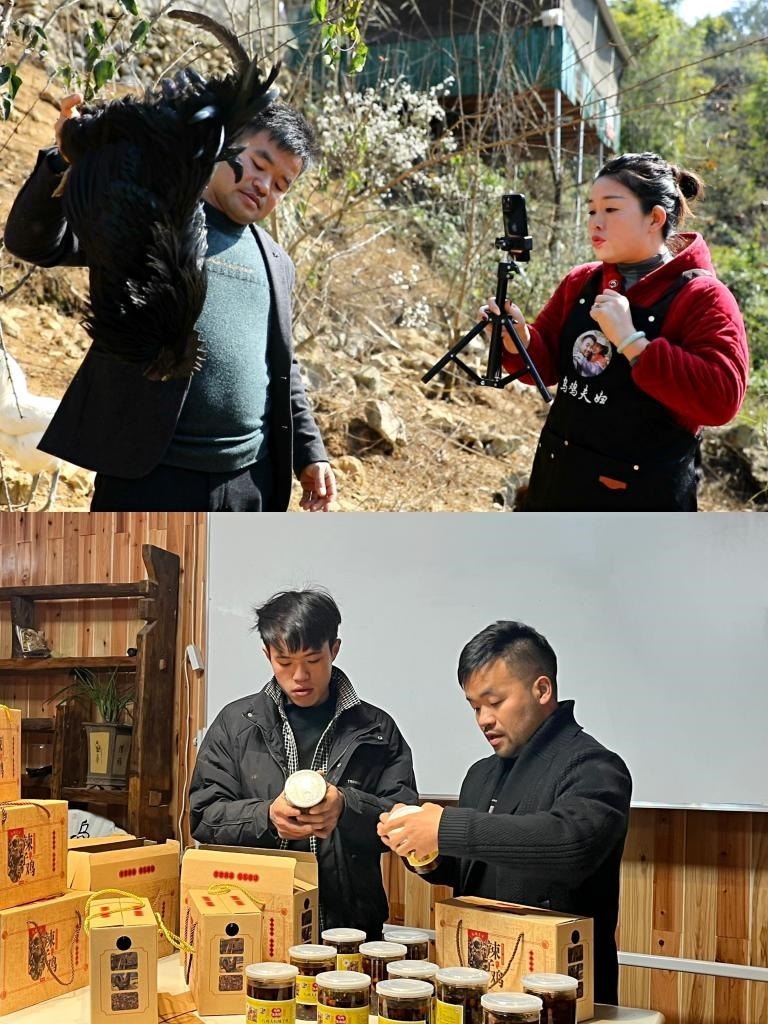 如今,山還是那些山,袁彬已將烏骨雞賣到全國各地。這背后是他為打開銷路進行的探索:他嘗試電商直播,直播間就設(shè)在雞棚。產(chǎn)地直銷、直播選貨……他的直播間經(jīng)?!氨瑔巍薄Hツ?月,袁彬帶著村里幾個年輕人一起搞電商直播,把他們培養(yǎng)成了月薪近萬元的帶貨主播。