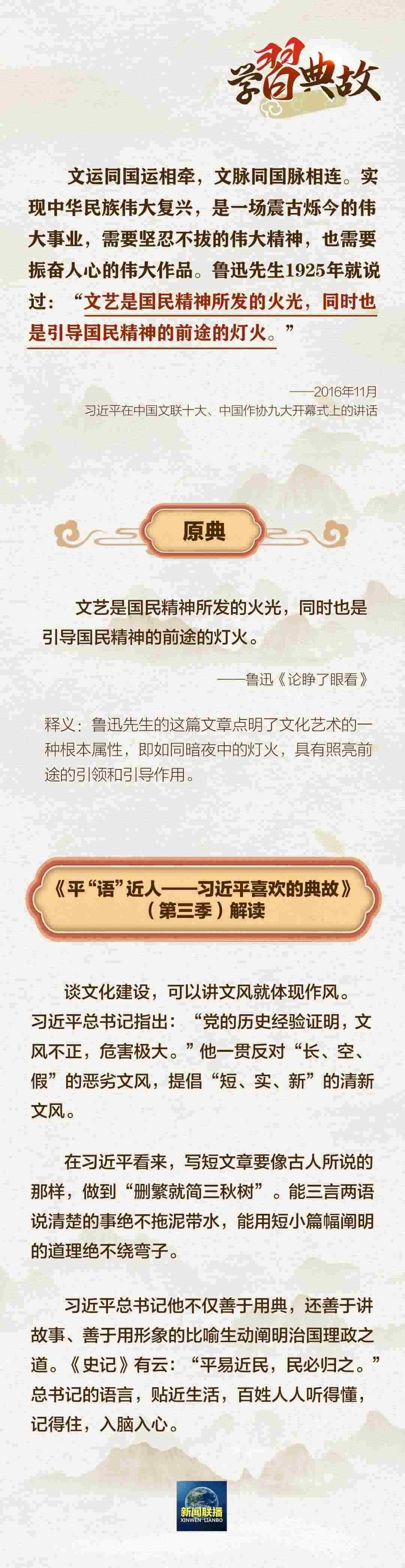 文運(yùn)同國運(yùn)相牽,文脈同國脈相連。文化自信是一個(gè)國家、一個(gè)民族發(fā)展中,最基本、最深沉、最持久的力量。黨的二十大報(bào)告中指出:“全面建設(shè)社會主義現(xiàn)代化國家,必須堅(jiān)持中國特色社會主義文化發(fā)展道路?!眹@“文化建設(shè)”這一主題,總書記曾講到哪些典故?一起學(xué)習(xí)↓↓↓