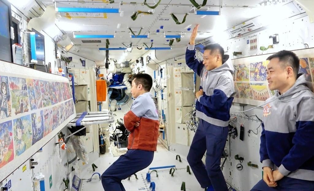 △2024年2月23日,神舟十七號(hào)航天員乘組在軌展示和介紹第三屆“天宮畫(huà)展”作品。