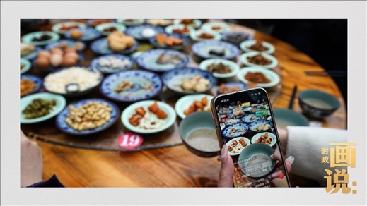 △游客用鏡頭記錄下豐盛的擂茶“壓桌菜”。2009年,擂茶習(xí)俗列入第三批“湖南省非物質(zhì)文化遺產(chǎn)代表性項目名錄”。