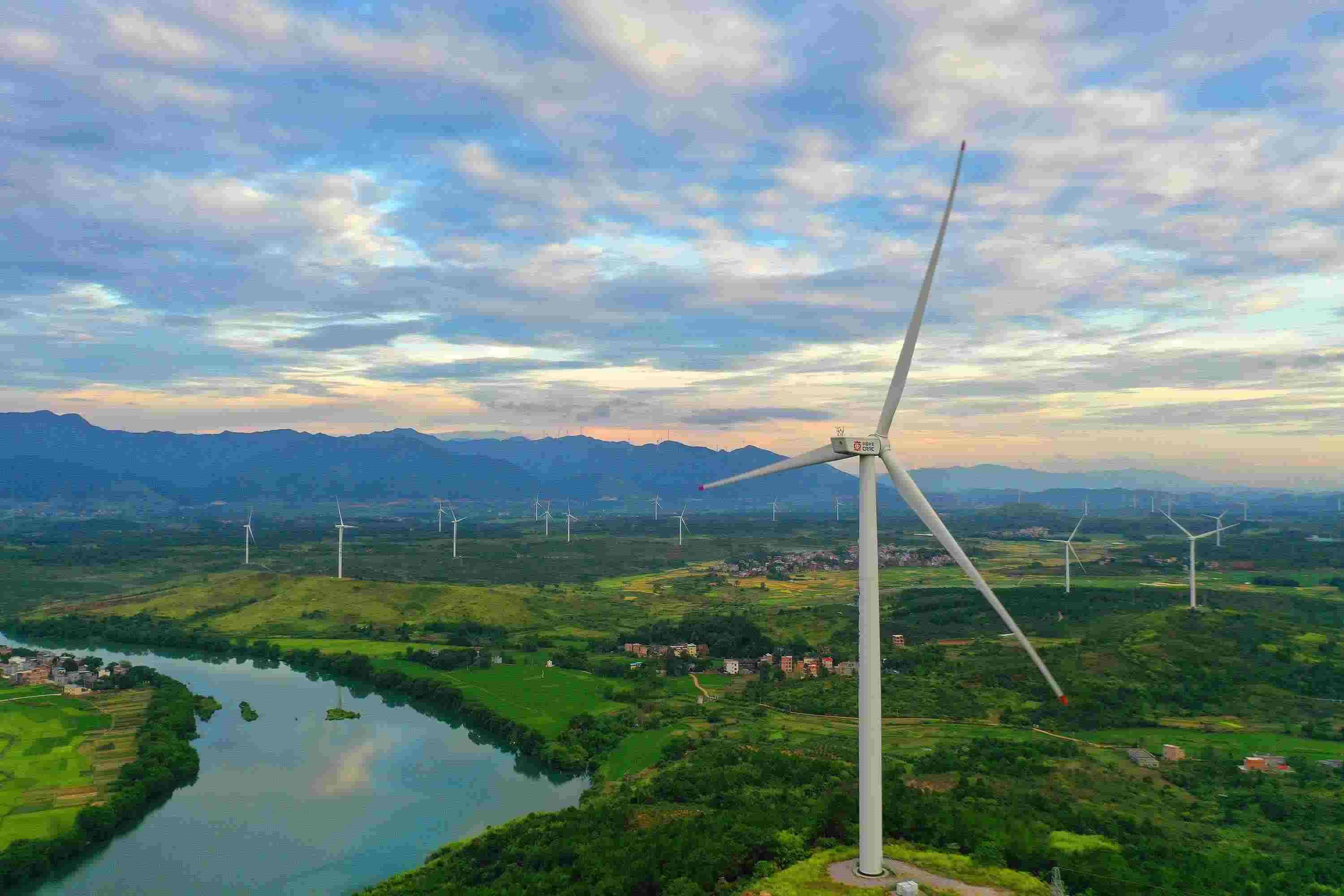 △ 湖南省永州市的風力發(fā)電風車與藍天、綠水、田野交相輝映,構成一幅美麗的生態(tài)畫卷。