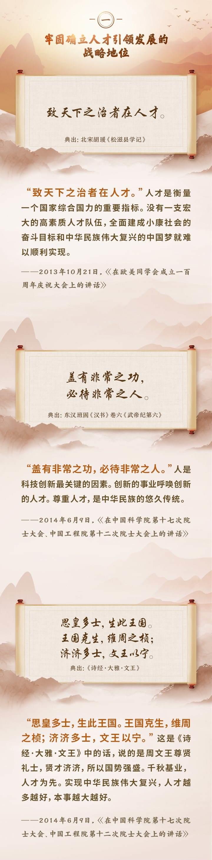 編者按:培養(yǎng)造就大批德才兼?zhèn)涞母咚刭|(zhì)人才,是國家和民族長遠(yuǎn)發(fā)展大計(jì)。黨的十八大以來,習(xí)近平總書記圍繞人才工作發(fā)表一系列重要論述,立意高遠(yuǎn),內(nèi)涵豐富,思想深刻,深刻回答了為什么建設(shè)人才強(qiáng)國、什么是人才強(qiáng)國、怎樣建設(shè)人才強(qiáng)國的重大理論和實(shí)踐問題。在這些重要論述中,總書記精妙運(yùn)用古代典籍、經(jīng)典名句,以古喻今、啟迪思想、激蕩精神,讓我們一起來學(xué)習(xí)!