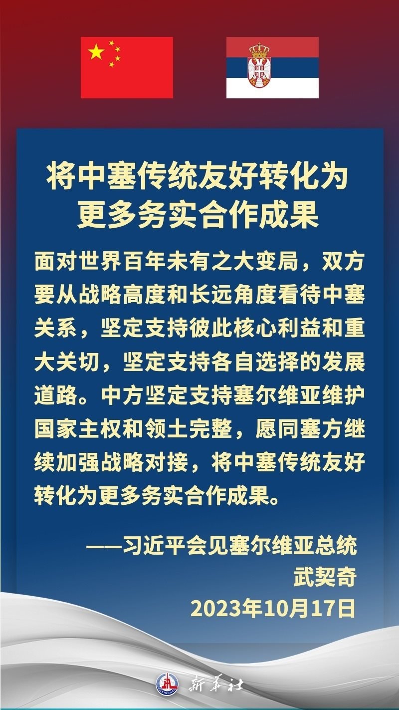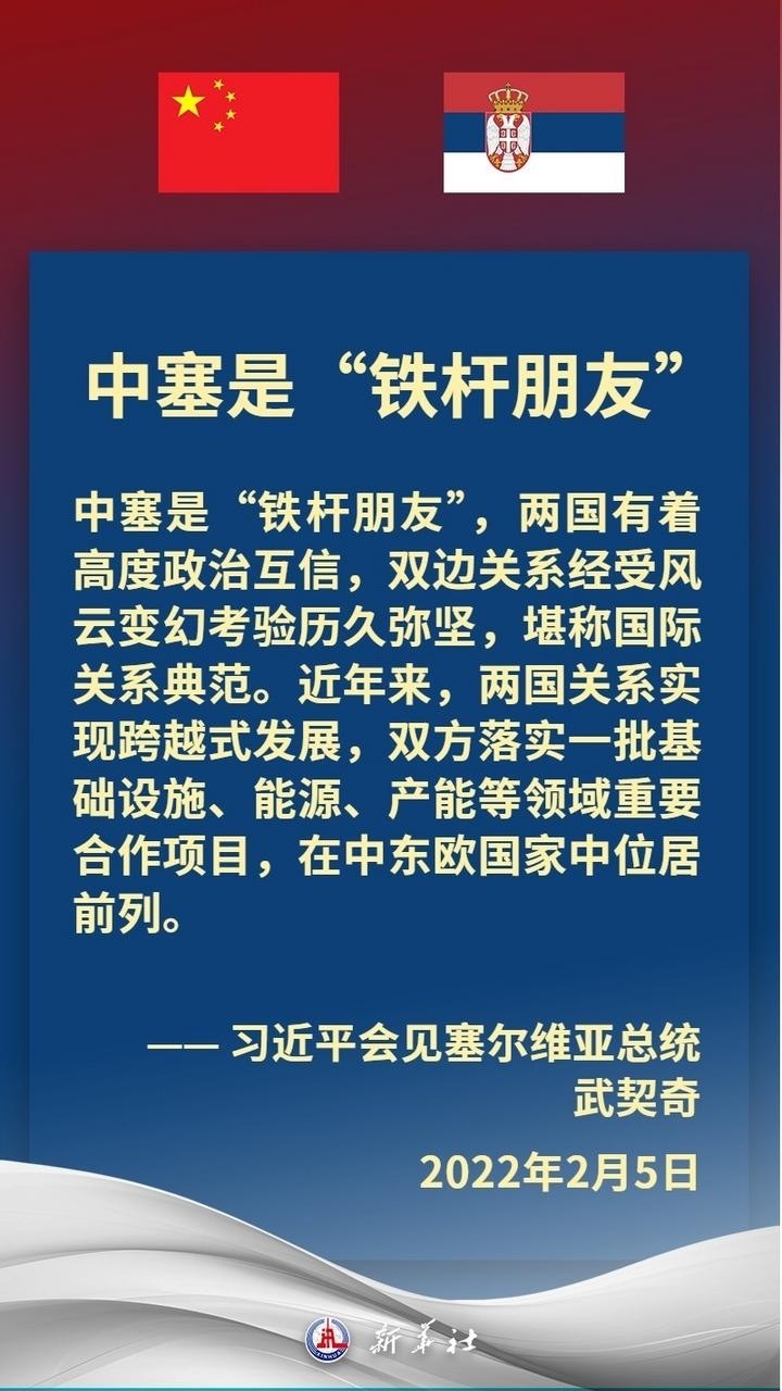 塞爾維亞是中國在中東歐地區(qū)首個全面戰(zhàn)略伙伴。近年來,在習(xí)近平主席和武契奇總統(tǒng)戰(zhàn)略引領(lǐng)下,中塞關(guān)系保持高水平運行,雙方堅定支持彼此核心利益和重大關(guān)切,兩國政治互信牢固,高質(zhì)量共建“一帶一路”取得豐碩成果,在多邊領(lǐng)域協(xié)調(diào)緊密。習(xí)近平主席多次在重要場合提及,中國和塞爾維亞是“鐵桿朋友”。