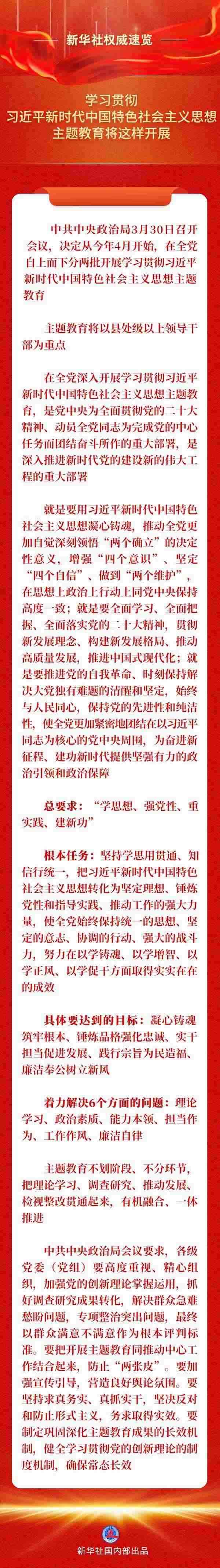 一圖速覽丨學(xué)習(xí)貫徹習(xí)近平新時(shí)代中國特色社會(huì)主義思想主題教育將這樣開展 中共中央政治局3月30日召開會(huì)議,決定從今年4月開始,......