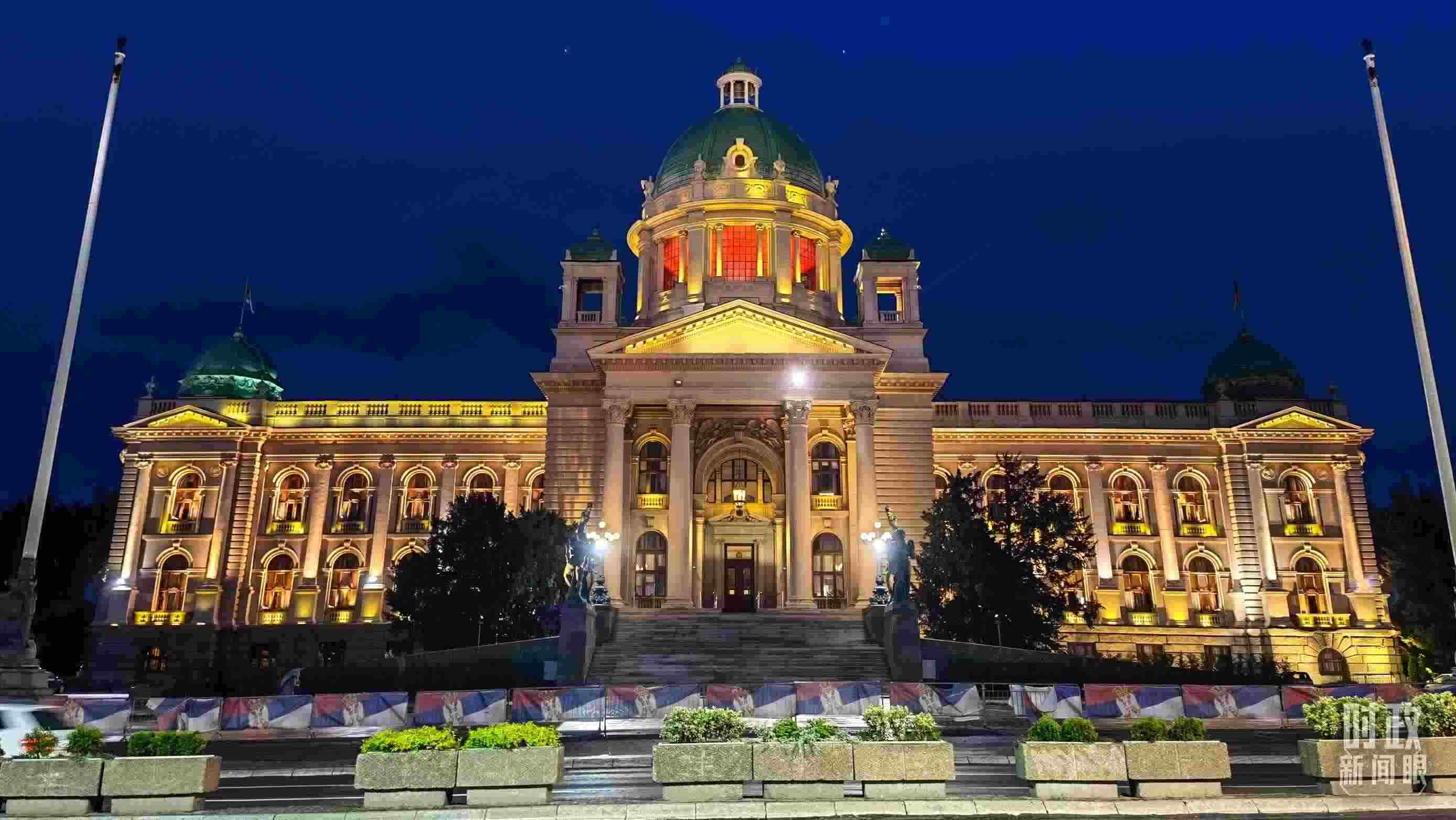△塞爾維亞國會大廈亮起紅燈,歡迎習(xí)主席到訪。(總臺央視記者石丞拍攝)