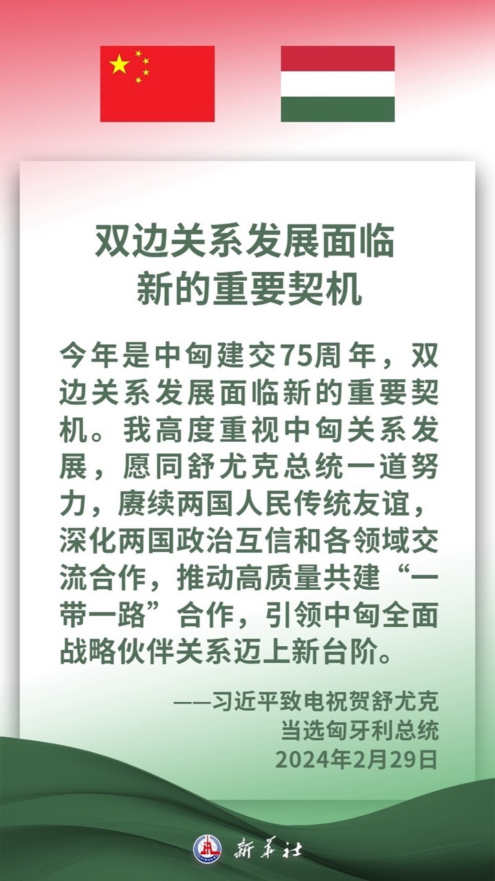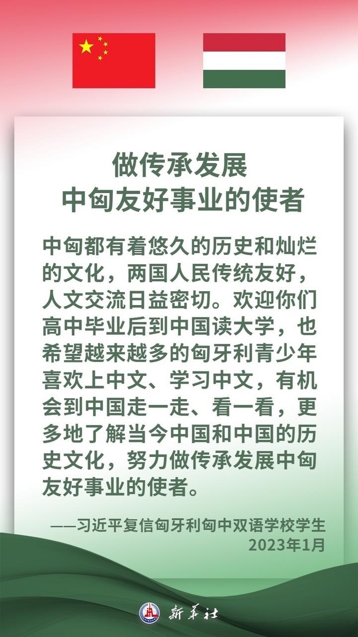 匈牙利是中東歐地區(qū)重要國(guó)家,是中方推進(jìn)共建“一帶一路”及中國(guó)-中東歐國(guó)家合作的重要合作伙伴。近年來,在兩國(guó)領(lǐng)導(dǎo)人的戰(zhàn)略引領(lǐng)下,中匈關(guān)系保持高水平發(fā)展,兩國(guó)高層交往密切,政治互信持續(xù)深化,各領(lǐng)域合作扎實(shí)推進(jìn)、成果豐碩,為兩國(guó)人民帶來切實(shí)利益。習(xí)近平主席說,中方愿同匈方繼續(xù)做彼此信賴、合作共贏的好朋友、好伙伴。