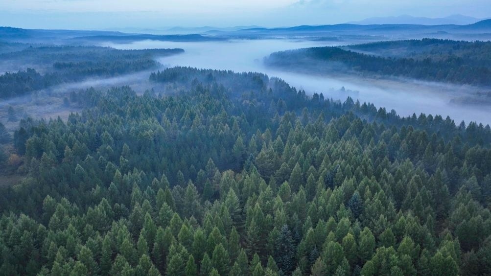 青霧繚繞的塞罕壩(無人機(jī)照片,2023年9月9日攝)。新華社發(fā)(劉滿倉攝)