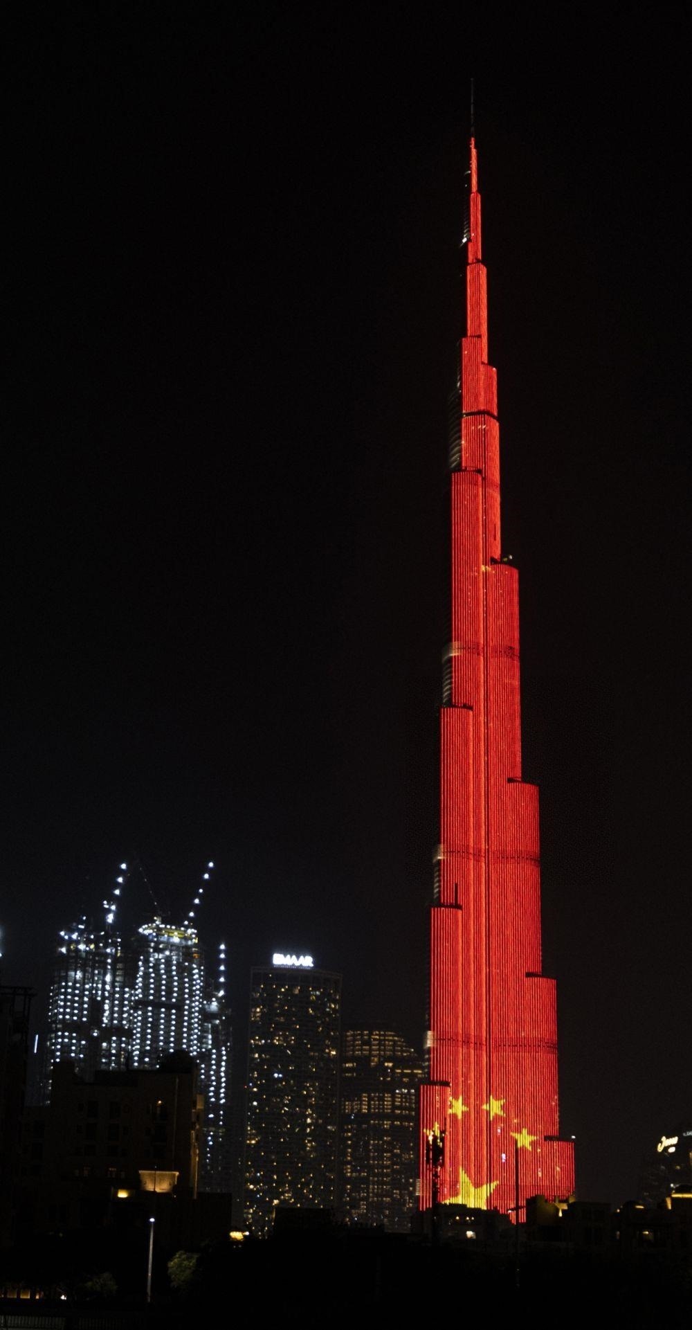 △當(dāng)?shù)貢r間2020年2月2日,在阿聯(lián)酋迪拜,當(dāng)?shù)氐貥?biāo)建筑物哈利法塔點(diǎn)亮中國國旗圖案,為中國抗擊新冠肺炎疫情加油。