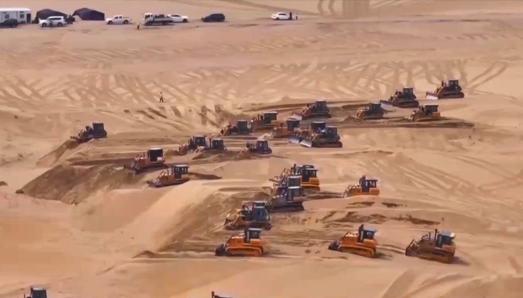 在內(nèi)蒙古鄂爾多斯的茫茫沙海中,近200臺(tái)推土機(jī)來回穿行,推平高低起伏、連綿不斷的沙丘,以便后續(xù)在此安裝光伏板。這正是當(dāng)下最新的光伏治沙模式中的一個(gè)環(huán)節(jié)。