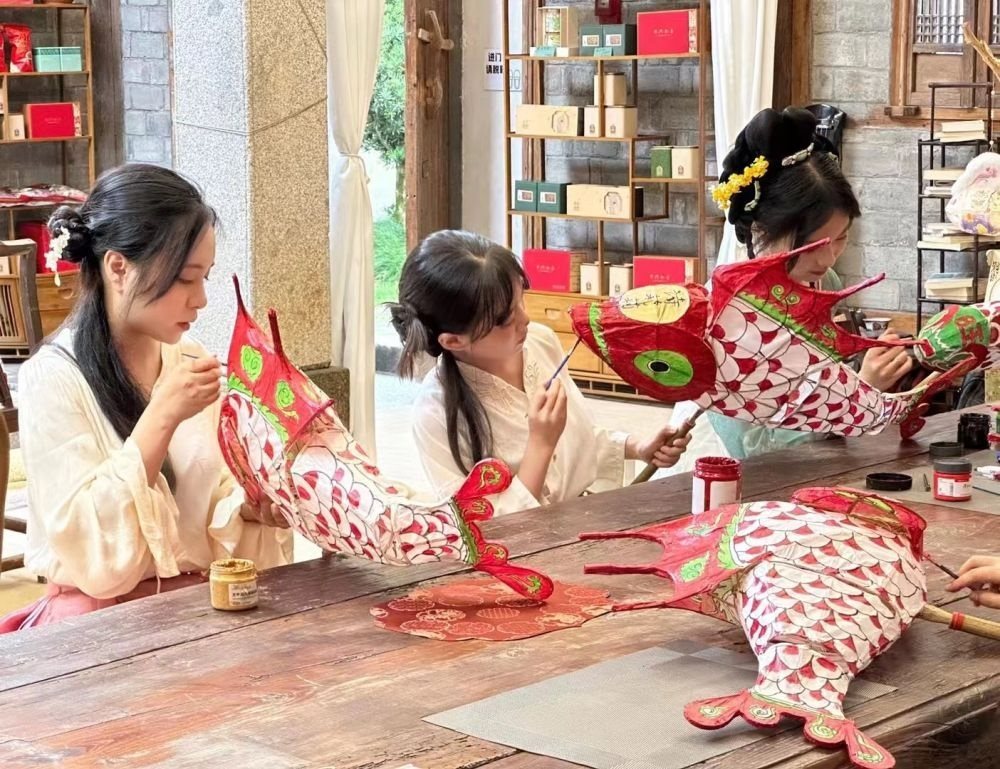 游客在西溪南村體驗制作魚燈。(受訪者供圖)