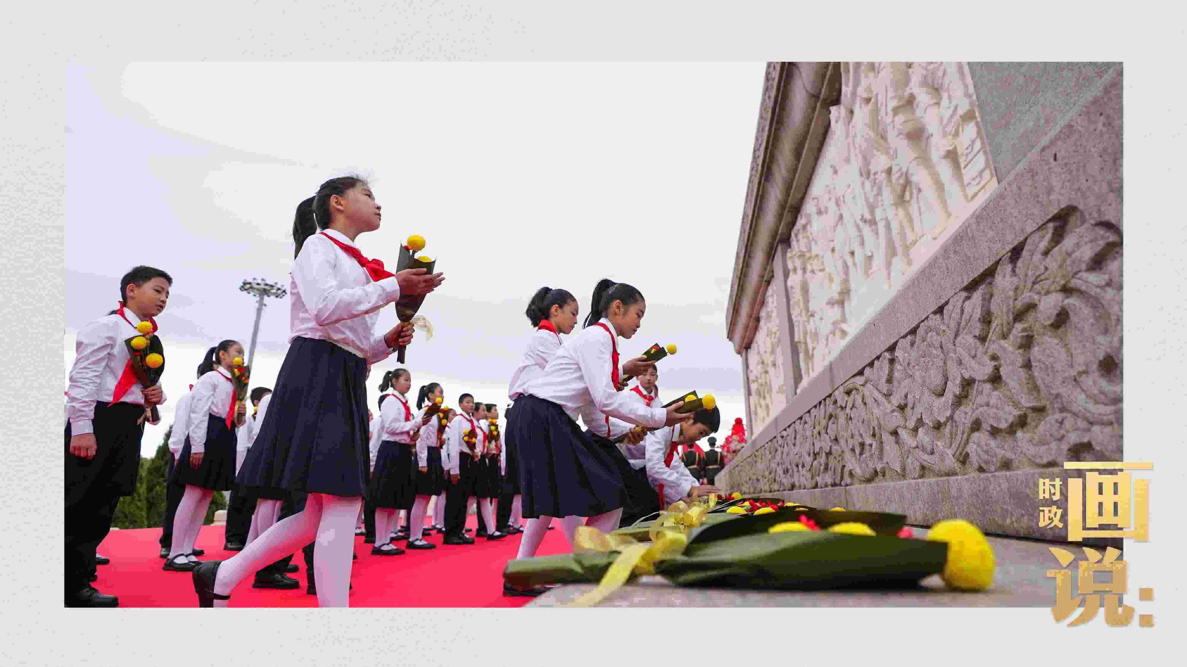 △少年兒童和各界代表依次走到紀(jì)念碑前,獻(xiàn)上手中鮮花并瞻仰紀(jì)念碑。