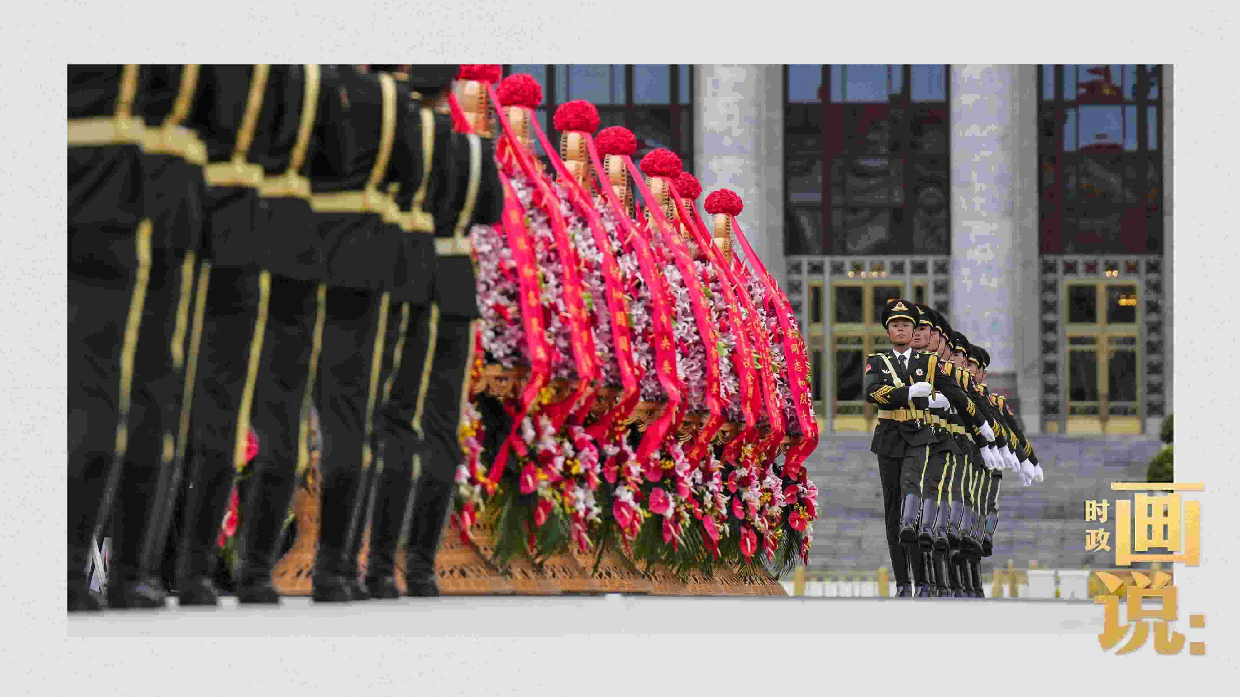 △禮兵抬起花籃,緩步走向人民英雄紀(jì)念碑。