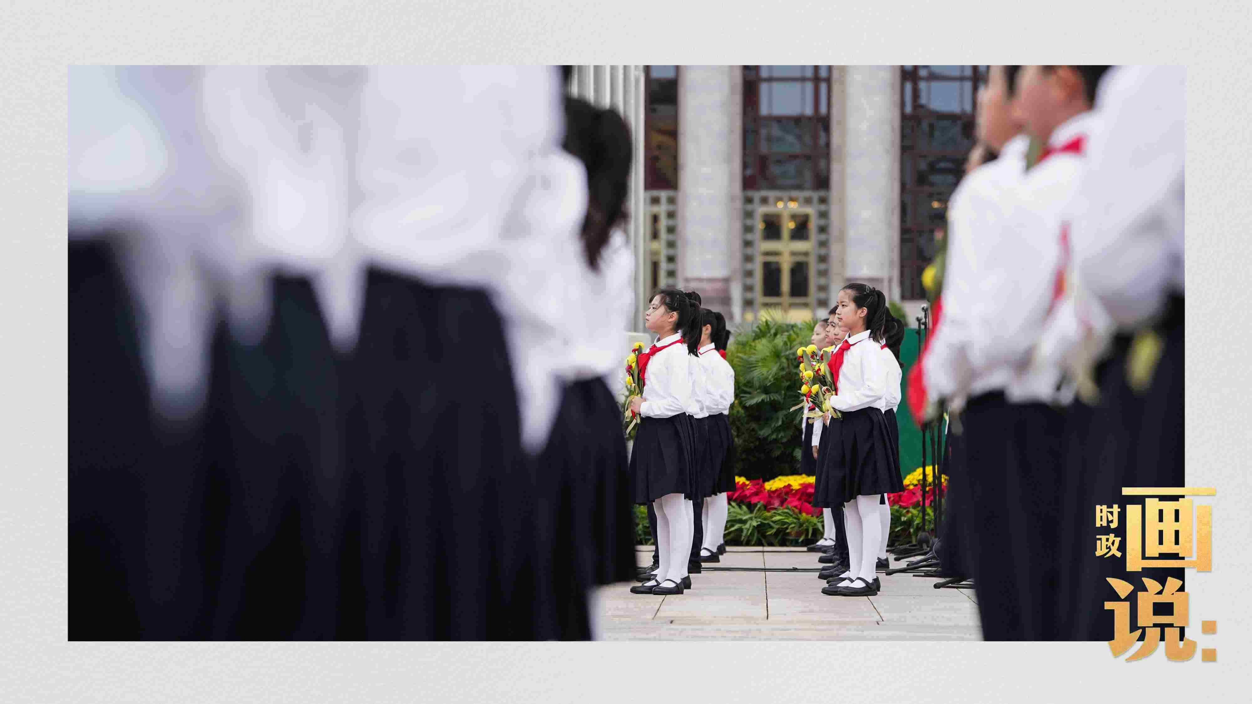 △手持鮮花的少年兒童面向人民英雄紀(jì)念碑高唱《我們是共產(chǎn)主義接班人》。