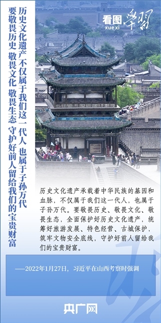 文化遺產(chǎn)是中華優(yōu)秀傳統(tǒng)文化的重要載體,承載著中華民族的基因和血脈。做好歷史文化遺產(chǎn)保護(hù)傳承工作,習(xí)近平總書(shū)記強(qiáng)調(diào),要統(tǒng)籌好旅游發(fā)展、特色經(jīng)營(yíng)、古城保護(hù),筑牢文物安全底線,守護(hù)好前人留給我們的寶貴財(cái)富。